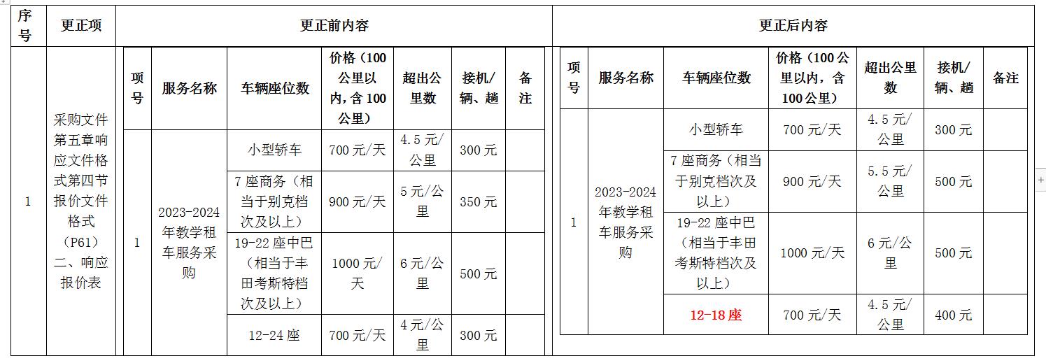 更正內(nèi)容:招標(biāo)文件中,所有租車價(jià)目表以更正后內(nèi)容為準(zhǔn):